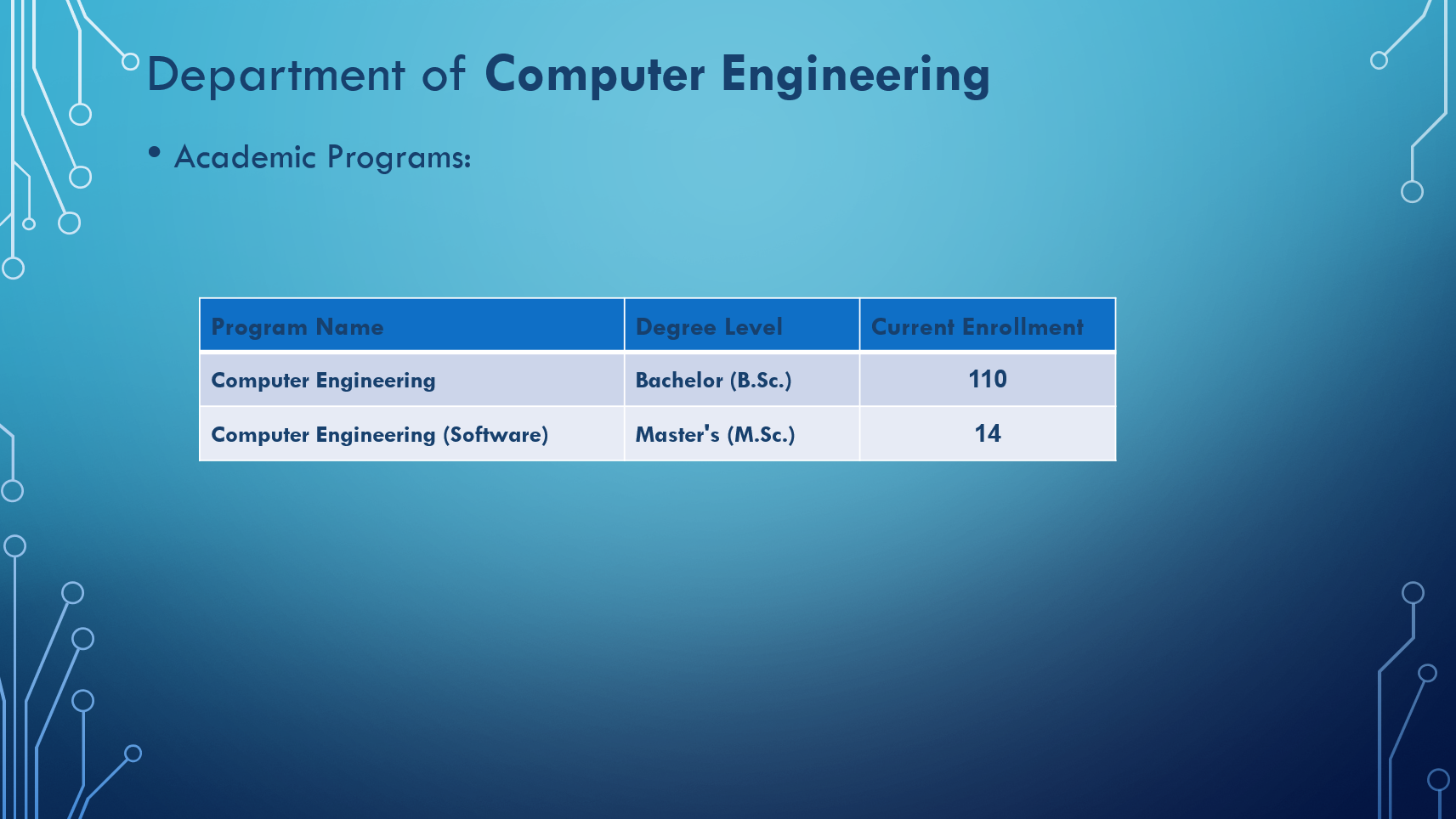 The Computer Engineering Department at Ardakan University has been admitting undergraduate students since 2012. By training skilled and competent professionals, the department has significantly contributed to the growth and development of this field and has responded to the increasing demands of society. Due to the high demand for innovation and technological advancement, Computer Engineering is recognized as one of the most popular and promising academic fields worldwide.